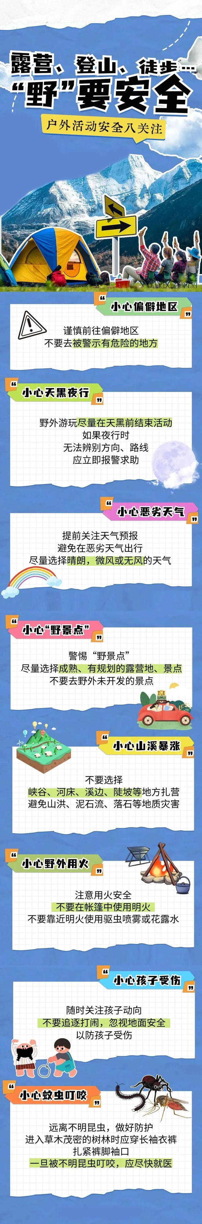 出游时应严格遵守当地政府及有关部门发布的公告、禁令、警示,不得擅自进入未开发、未对公众开放的保护区、水库、峡谷、无人岛、海滩、网红景点等“野景点”区域开展登山、游览、探险、戏水、露营等活动,自觉到“野景点”旅游打卡的行为。