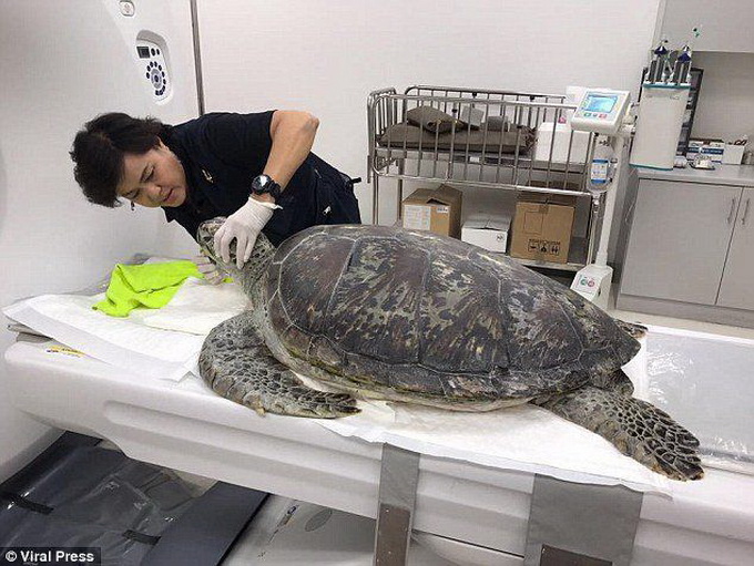 CT扫描显示海龟的胃里有一大块金属。据估计Bank误吞了相当于2000泰铢(约合45英镑)的硬币。兽医希望在Bank的整体健康状况有所好转之后再为它进行手术。